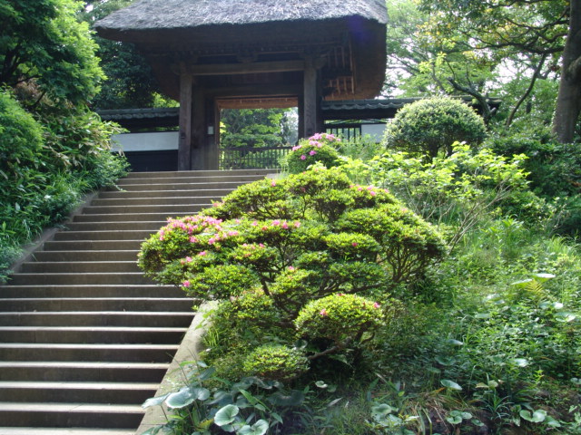円覚寺境内にある、帰源院の門前にはサツキが彩りを添えています。しかし、満開には少し早いです。帰源院は、夏目漱石、島崎藤村らが滞在し、小説「門」「春」の舞台になっています。帰源院の敷地内は入れません。