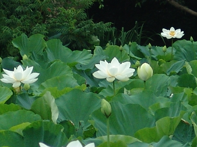 鶴岡八幡宮の源平池のハスはあまりたくさん咲いていません。それでも、平家池(小さい池)のほうには、白いハスが多く見られます。つぼみもたくさんあります。