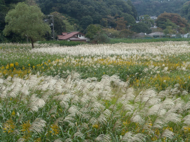 永福寺跡ではセイダカアワダチソウが黄色花が咲き始めています(左)。北米産の嫌われ者の草花ですが、すっかり日本の秋を代表する花になりました。ススキがこの花に侵食されています。年々セイダカアワダチソウの方が増えてきています。ススキもセイダカアワダチソウも来週あたりが一番の撮り頃だと思います。朝は逆光になりススキが光って綺麗に撮れると思います。