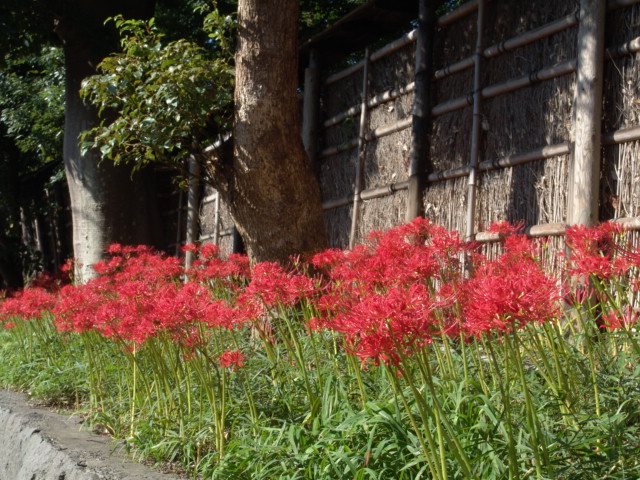 鶴岡八幡宮の横の通路。垣根に沿ってヒガンバナが満開になってきました(左)。こんなに遅く咲くのは2年ぶりです。まだまだ、撮影できそうです。降雨の日か、曇りの日が撮影日和です。