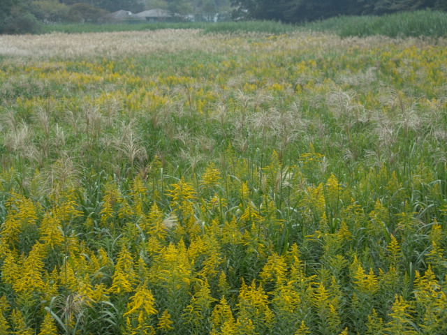 ススキも輝いています。ススキはもう少し経った方が綺麗だと思います。朝日や夕日の時間帯に撮ると一番いいのではないかと思います。しかし、来週になるとセイダカアワダチソウは茶色くなるのではないかと思います。