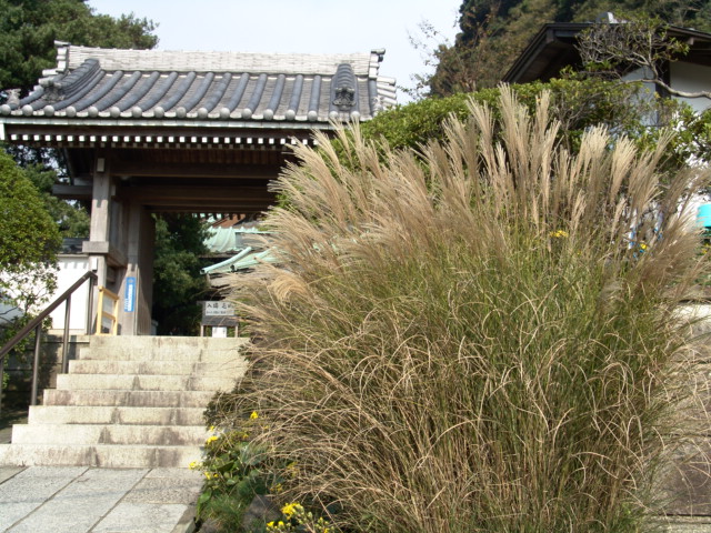 安養院では門前のススキが花穂をつけています。安養院はツワブキが門の外にも境内にもたくさん植えられています。半分程度咲きだしています。これからもっと綺麗に咲きそろうのではないかと思いました。ここも、いつのまにか、三脚一脚の使用禁止の立て札が建ってしまいました。