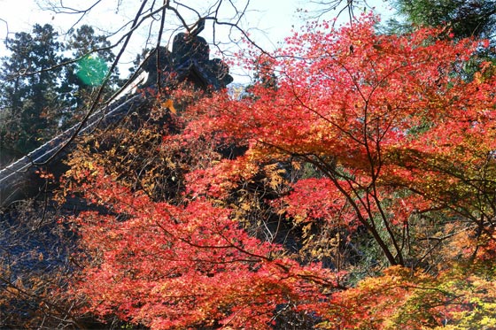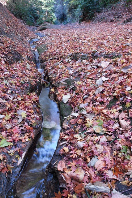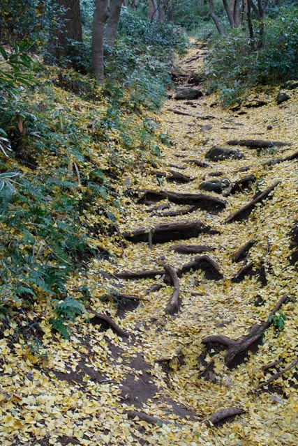 ハイキングコースの天園に続く獅子舞谷も紅葉が始まりました。もう少し経った方が赤が綺麗になると思います。イチョウは散り始めています。山道はイチョウの落葉で黄色い絨毯のようになっています。最近、ここの紅葉もよく知られるようになったので、おおぜいのハイカーがおとずれて混雑しています。