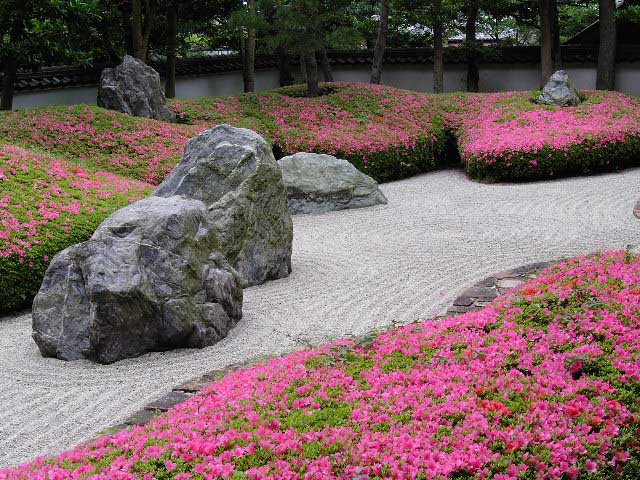 光明寺の石庭にも満開のサツキをみることができます。ちょうど今、見頃です。ただ、雑草が結構目立ちます。ここにもアジサイがたくさんあったのですが、境内の整備とともに数が少なくなりました。少し色ずいています(写真)。