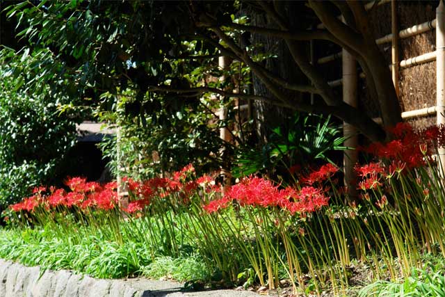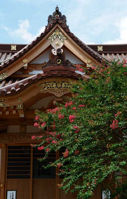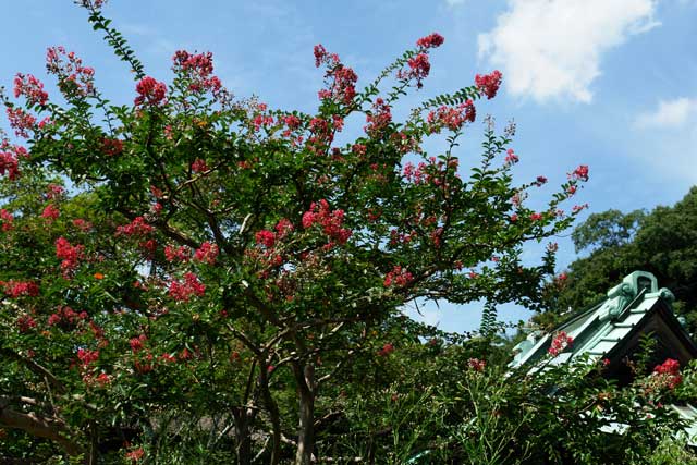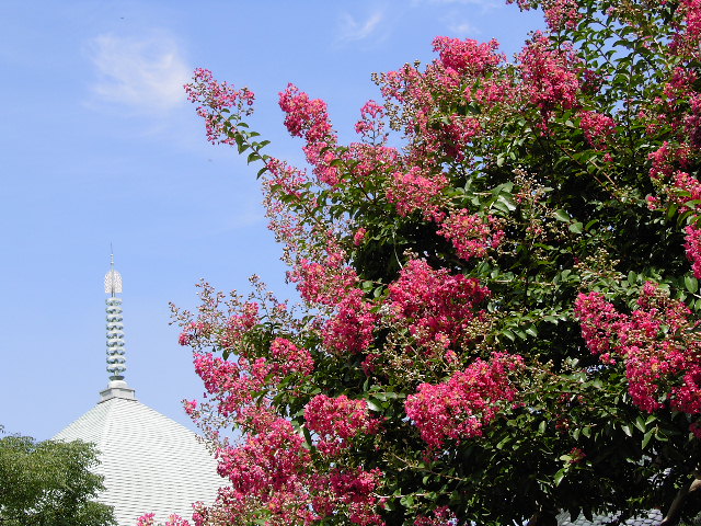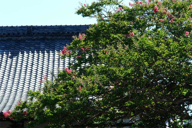本覚寺のサルスベリが満開になりました。例年なら8月の初旬に見頃を迎えるのに今年はなかなか綺麗になりませんでしたが、9月になってから真っ赤に満開になっています(写真左)。本興寺も少し花を着けてきました。写すには寂しすぎますが赤い花をちらほらつけています(写真右)。