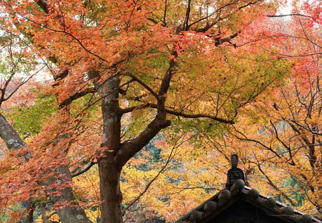 北鎌倉の円覚寺は晩秋を迎えています。紅葉の葉も茶色になり始めています。それでも逆光に葉の裏から撮るときれいに見えます(写真)。