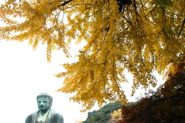 長谷寺は紅葉がきれいになってきました(左)。高徳院大仏は、黄葉は今が一番いいです。少し散っているのもあります(右)。