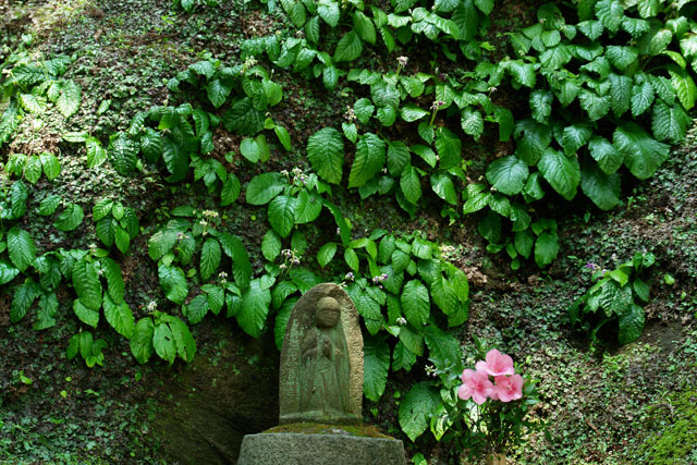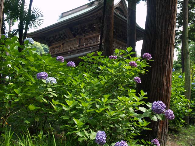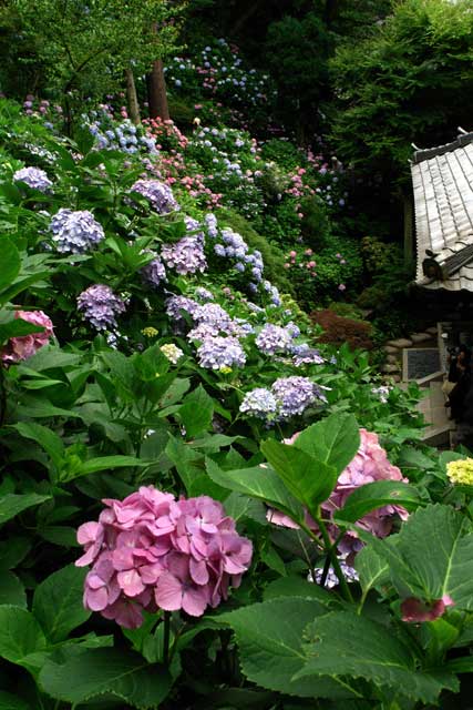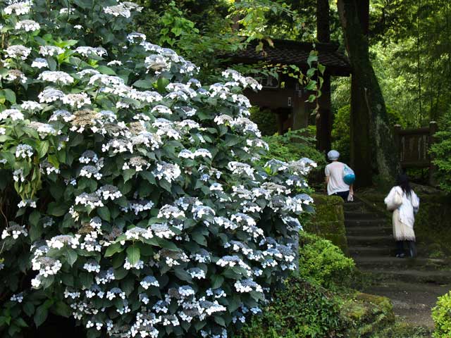 円覚寺のアジサイもほぼ満開です。境内が広いのであまり目立ちませんがたくさんあります(左)。浄智寺にもアジサイはありますが量は少ないです。門前のアジサイが目立ちます(右)。