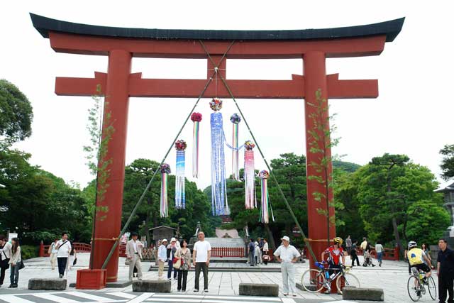 鶴岡八幡宮では七夕祭(7月7日)の飾り付けが始まりました。写真は三ノ鳥居です(右)。