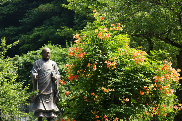 妙本寺にはノウゼンカズラが咲きだしています。二天門をくぐった左側が咲いています。そばの日蓮様の銅像が見つめています。