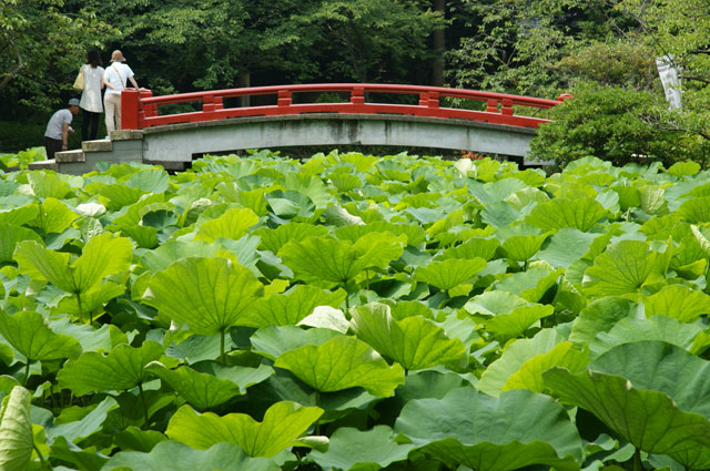 鶴岡八幡宮源平池のハスは今年はあまり花が咲いていません(左)。花芽の数も少ないと思います。
