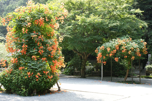 妙本寺二天門両脇のノウゼンカズラは満開です(左)。材木座の来迎寺のノウゼンカズラは一つも花がありませんでした。