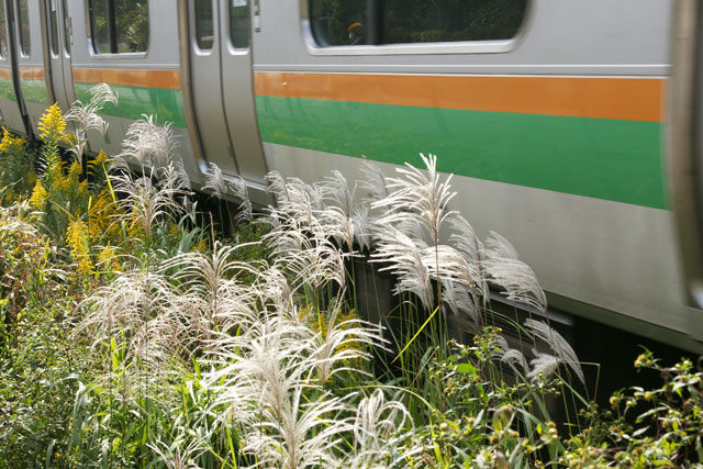 横須賀線沿線にはススキ、セイダカアワダチソウが木漏れ日に光っていました(左)。