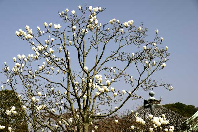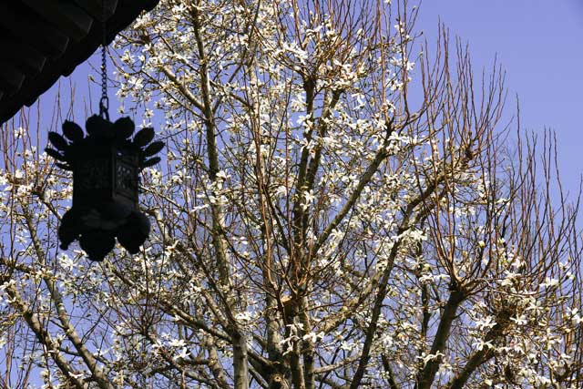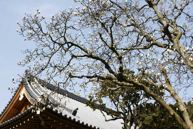 北鎌倉の円覚寺、大勢の観光客が訪れています。仏日庵にあるハクモクレンも見頃になりました。上の枝は蕾ですが下の方は白色がまぶしく咲いています。
