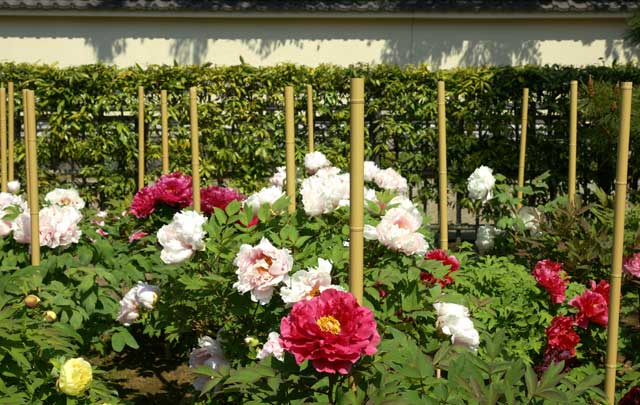 北鎌倉の建長寺はボタンで有名。今、満開を迎えています。境内の花壇のほとんどをボタンで占めています。鐘楼横の嵩山門付近の参道にもたくさんのボタンが並んで咲いています。