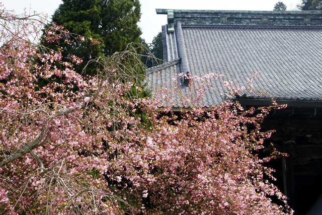 広い境内にはカイドウとヤエザクラの競演になっています(写真下)。