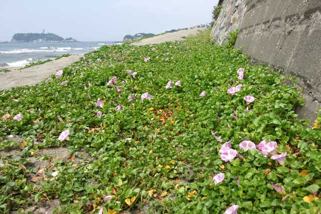蒸し暑く感じる日です。七里ガ浜のハマヒルガオは非常に少ないですが、コンクリート壁に沿ってわずかに咲いています。写真では多く見えますがほんのわずかです。