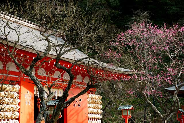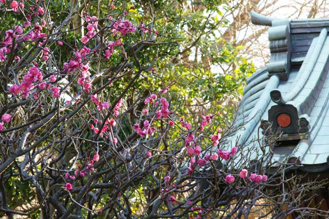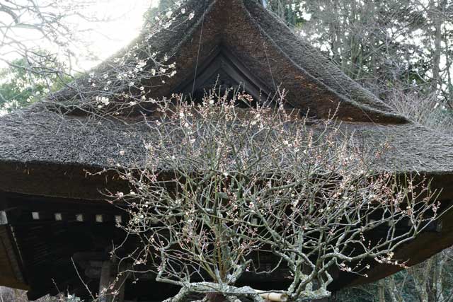 荏柄天神社では紅梅がだいぶ咲いていますが、社殿手前の白梅はまだほとんど咲いていません。