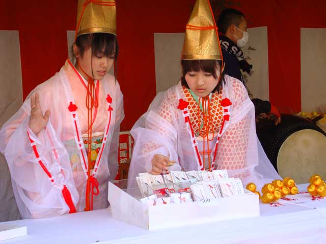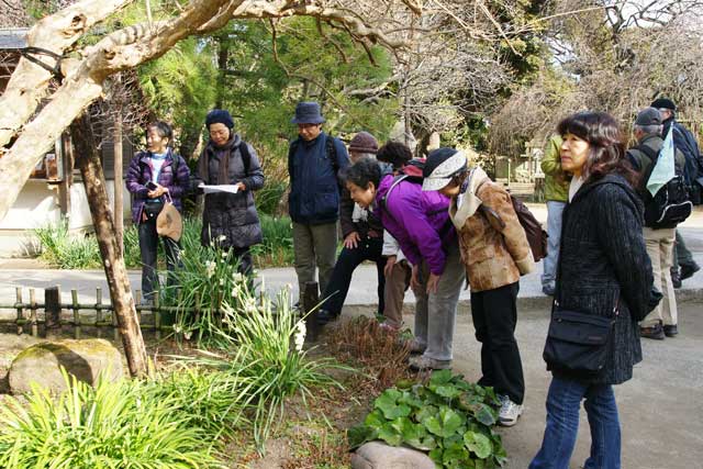 境内にはスイセンが咲き、福寿草が芽を出して、参拝客を楽しませています(写真右)。