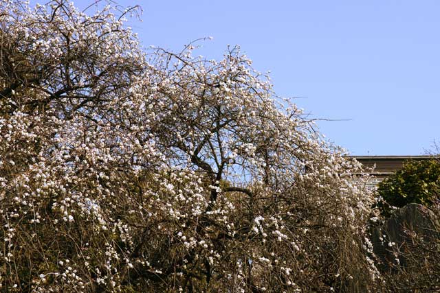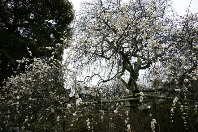 宝戒寺の白いシダレウメは八分程度咲いています(写真下)。