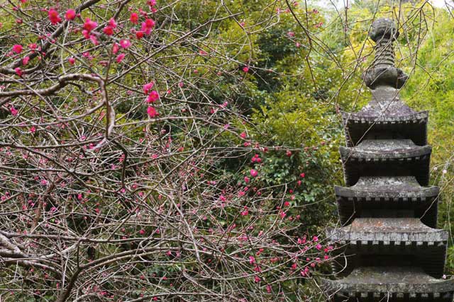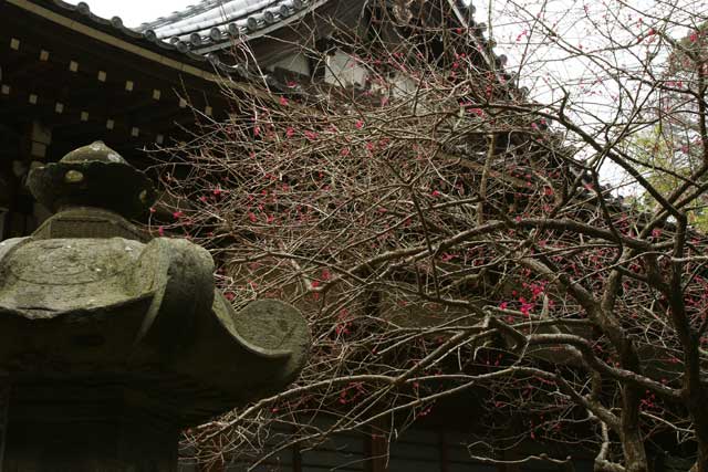 宝戒寺のシダレザクラはまだ3部程度の開花です(写真下左)。境内にはほかのウメがだいぶ咲いています(写真下右)。