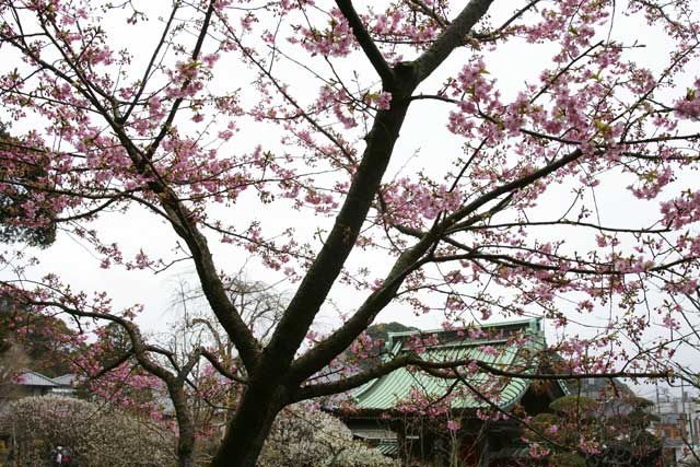 大船と北鎌倉の中間にある成福寺、ウメの花は散ってしまいましたが茅葺き屋根の山門脇、河津桜がほぼ満開になっています。横須賀線の車窓からよく見えます(写真上)。
