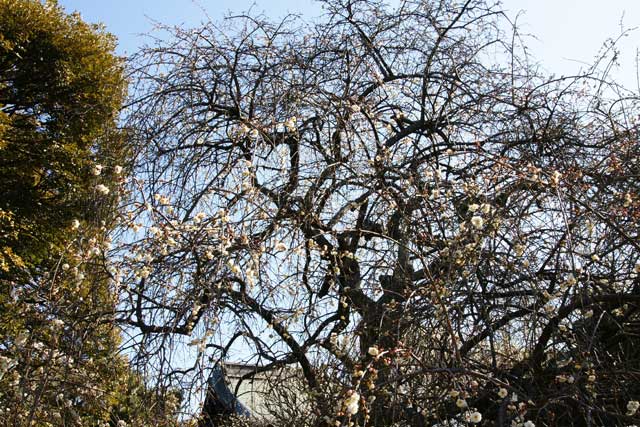 モノレールの湘南江の島駅の近く、常立寺のシダレウメは白梅はほぼ満開です。