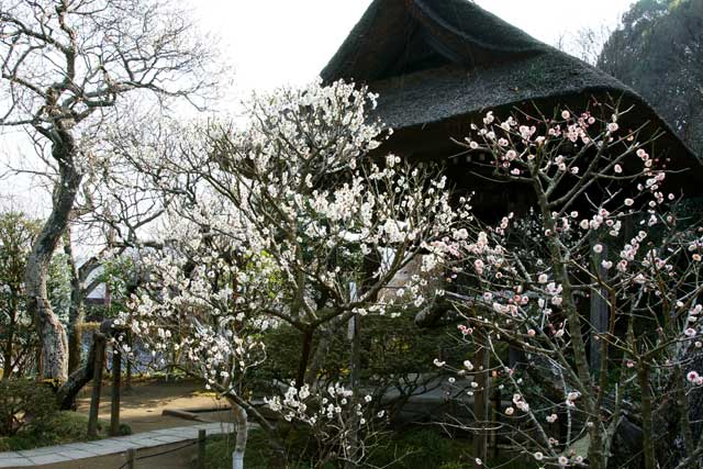 瑞泉寺の上の境内のウメはだいぶ咲いています(写真上、中)。入口受付のそばの庭園のウメは日当りが悪いのでまだまだ咲いていません。