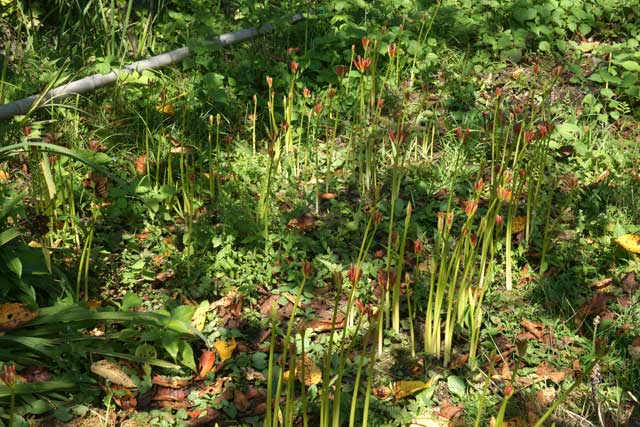 紅色のヒガンバナの芽が出てきていました。あと1週間ほどで満開かと思います。