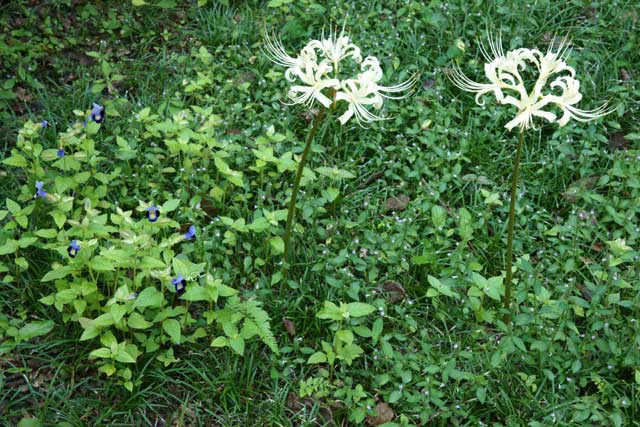 白いハギがだいぶ咲いてきました(写真左)。白いヒガンバナも咲きだしそうでした。