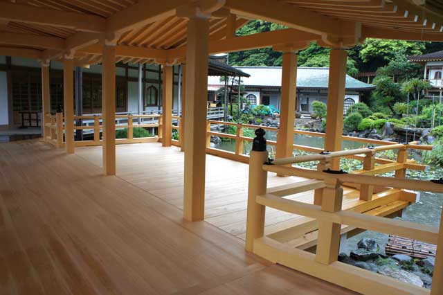 記主庭園を眺める回廊・縁台の修復が終わりました。池にハスが咲く頃が楽しみです。