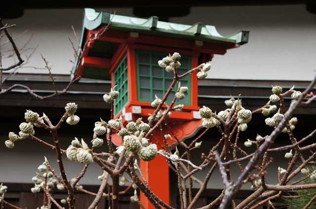 荏柄天神社の寒紅梅がやっと少し開花してきました。ミツマタの蕾も大きくなりました。