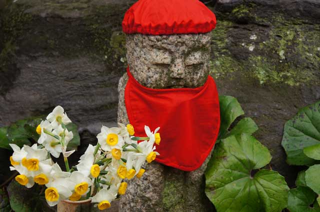 安産祈願の「おんめさま」、大巧寺の福寿草も芽を出しました(左)。