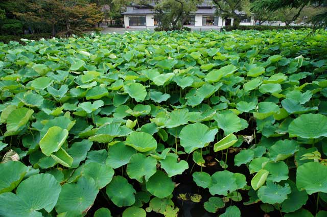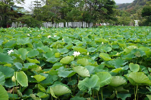 鶴岡八幡宮の源平池、ハスの葉が池を埋め尽くしています。
