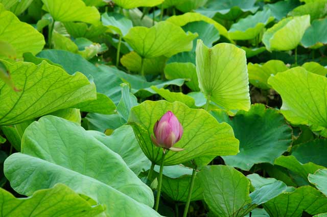 鶴岡八幡宮・源平池がハスの葉ですっかり埋め尽くされました。蕾が幾つか見られました。