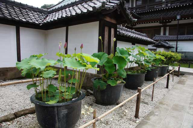 本覚寺には鉢の中のハスが一輪咲き出しています。