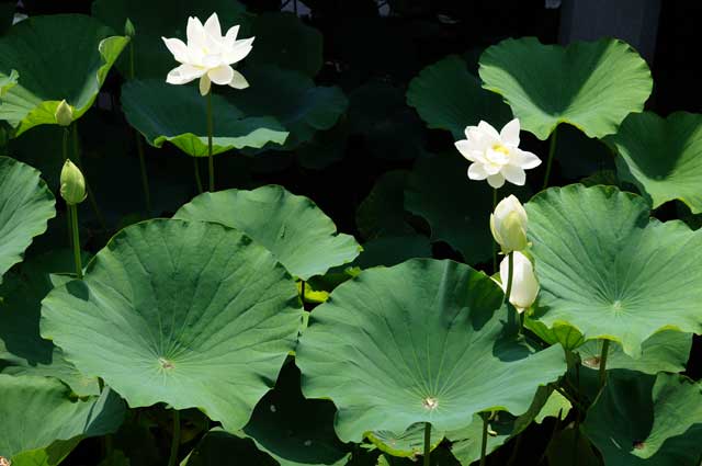 今は、平家池の白いハスの花がほぼ見頃になっています。