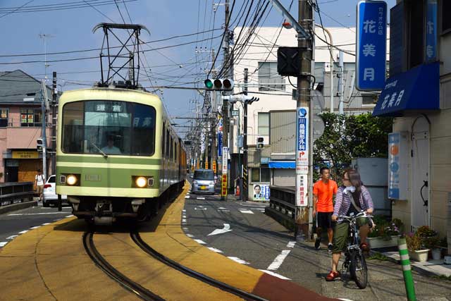 山門前を江ノ電が走っています。花はムクゲ以外にあまり咲いていません。