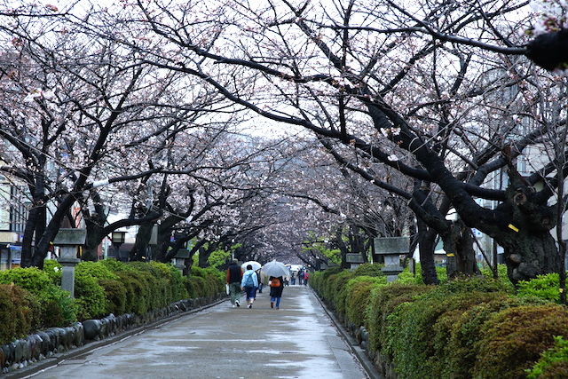鶴岡八幡宮に続く段葛のサクラ、三部咲きぐらいになっています(写真左)。