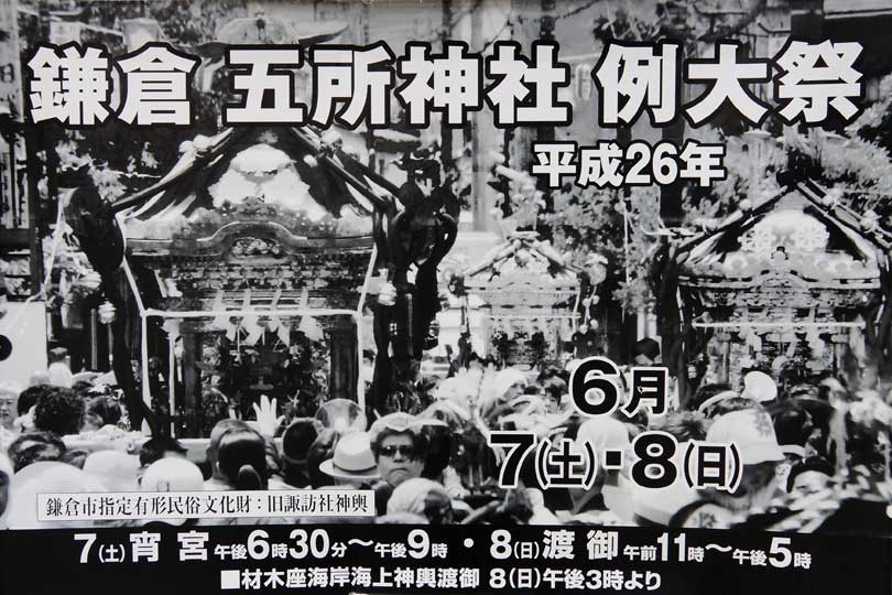 材木座の五所神社例大祭は6月7日と8日。海上神輿渡御は8日午後3時。(参照、下右ポスター)