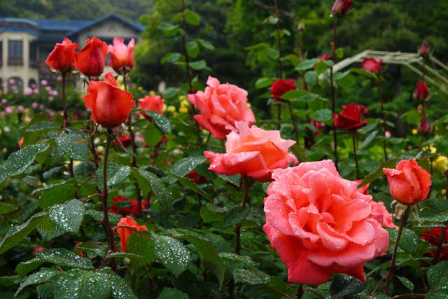 雨の中、世界のバラが見頃になっていました。新緑も綺麗でした。