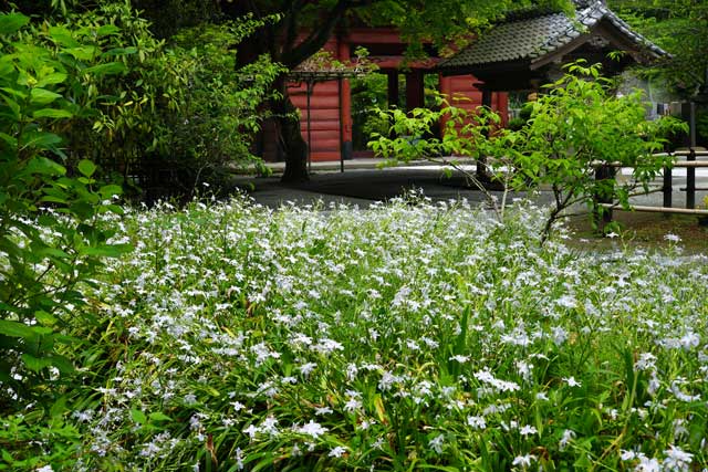 「苔寺」の妙法寺、多くの花が咲いています。石段の両脇はシャガが群生。