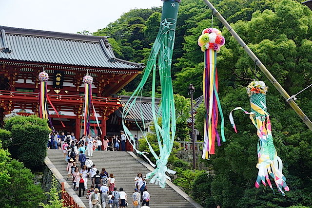 鶴岡八幡宮では七夕飾りの吹き流しが笹竹に掲げられていました。