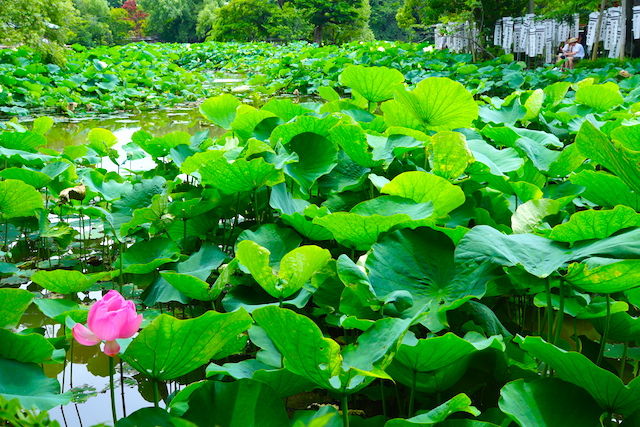 源平池はハスの葉で水面の三分の二くらいが埋まっていました。