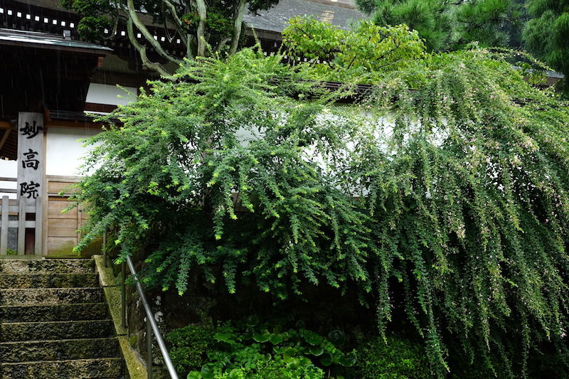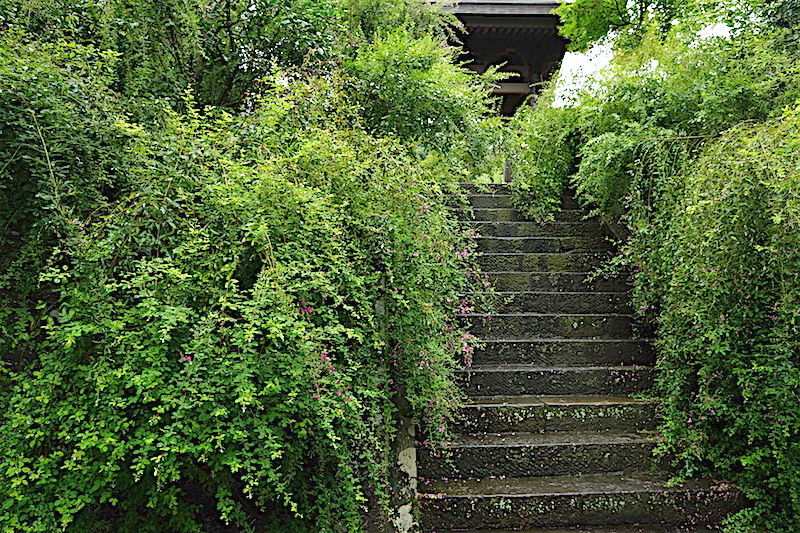 山門の側のハギの葉もだいぶ茂ってきました(写真右)。