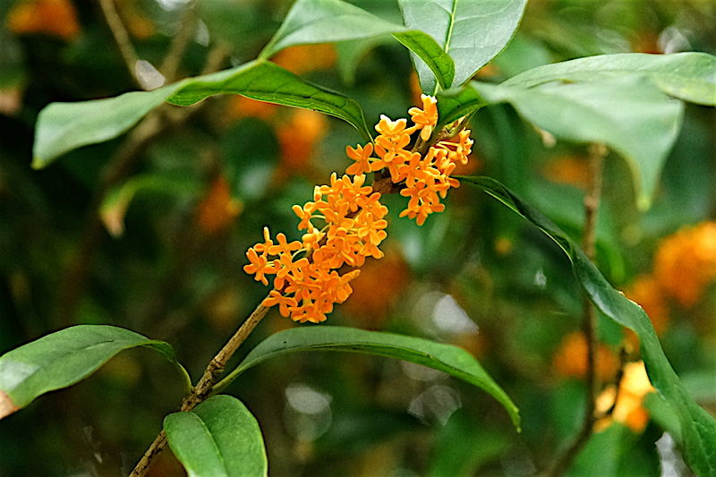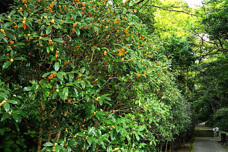 妙本寺のキンモクセイは薄暗い参道に植えられています。