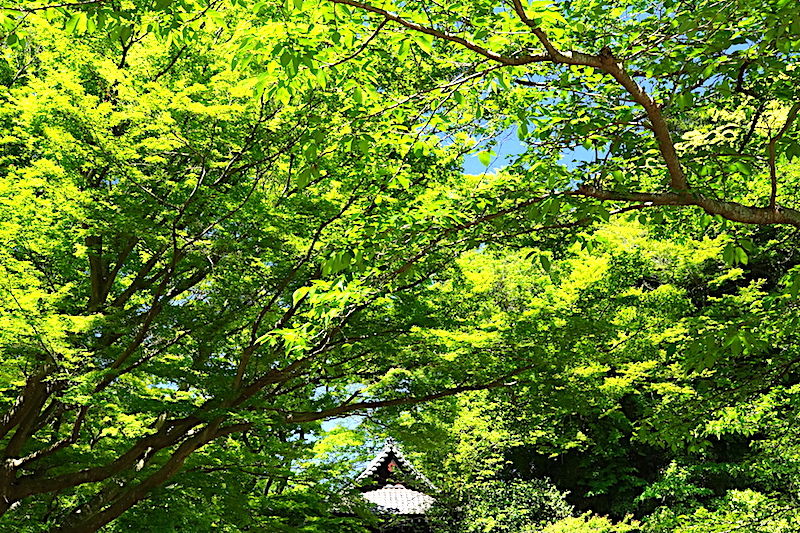 妙本寺では、太陽に照らされた新緑の葉が、光って見えていました。