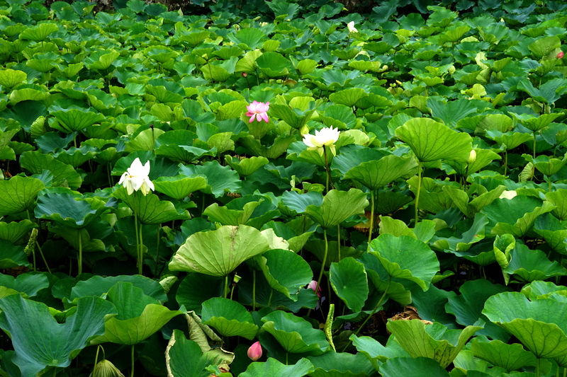 源平池は蓮の葉で覆われていました。岸近くに花は咲いていません。