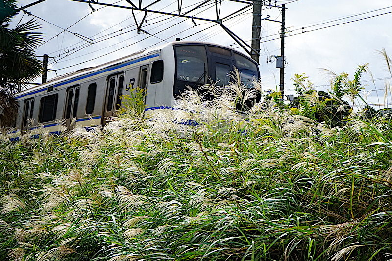 「英勝寺」前を走る横須賀線、向い側の土手にはススキが揺れていました。