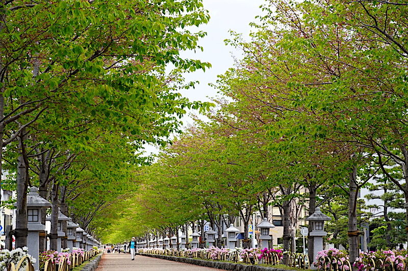 のサクラ並木、花はすっかり散り、緑の葉がたくさん出てきました。